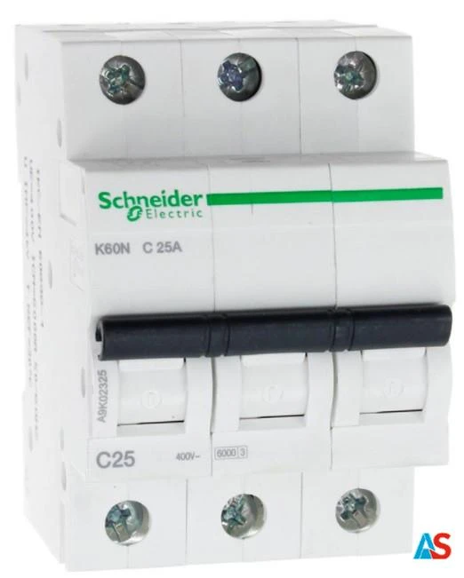 Wyłącznik nadprądowy 3P C 25A 6kA AC K60N A9K02325, firmy Schneider Electric. Wyłącznik nadprądowy serii K60 firmy Schneider Electric przeznaczony do zabezpieczania obwodów elektrycznych przez skutkami przeciążeń i zwarć. Eska A9K02325 posiada znamionową zdolność zwarciową 6kA, występuje w wersji 3P (3-fazowej), o charakterystyce wykonania C oraz prądzie znamionowym 25A. Najważniejszą zaletą wyłączników nadprądowych jest w przeciwieństwie do tradycyjnych wkładek bezpiecznikowych możliwość wielokrotnego ich użycia. O przewadze nad wkładkami topikowymi decyduje również wysoka czułość działania.